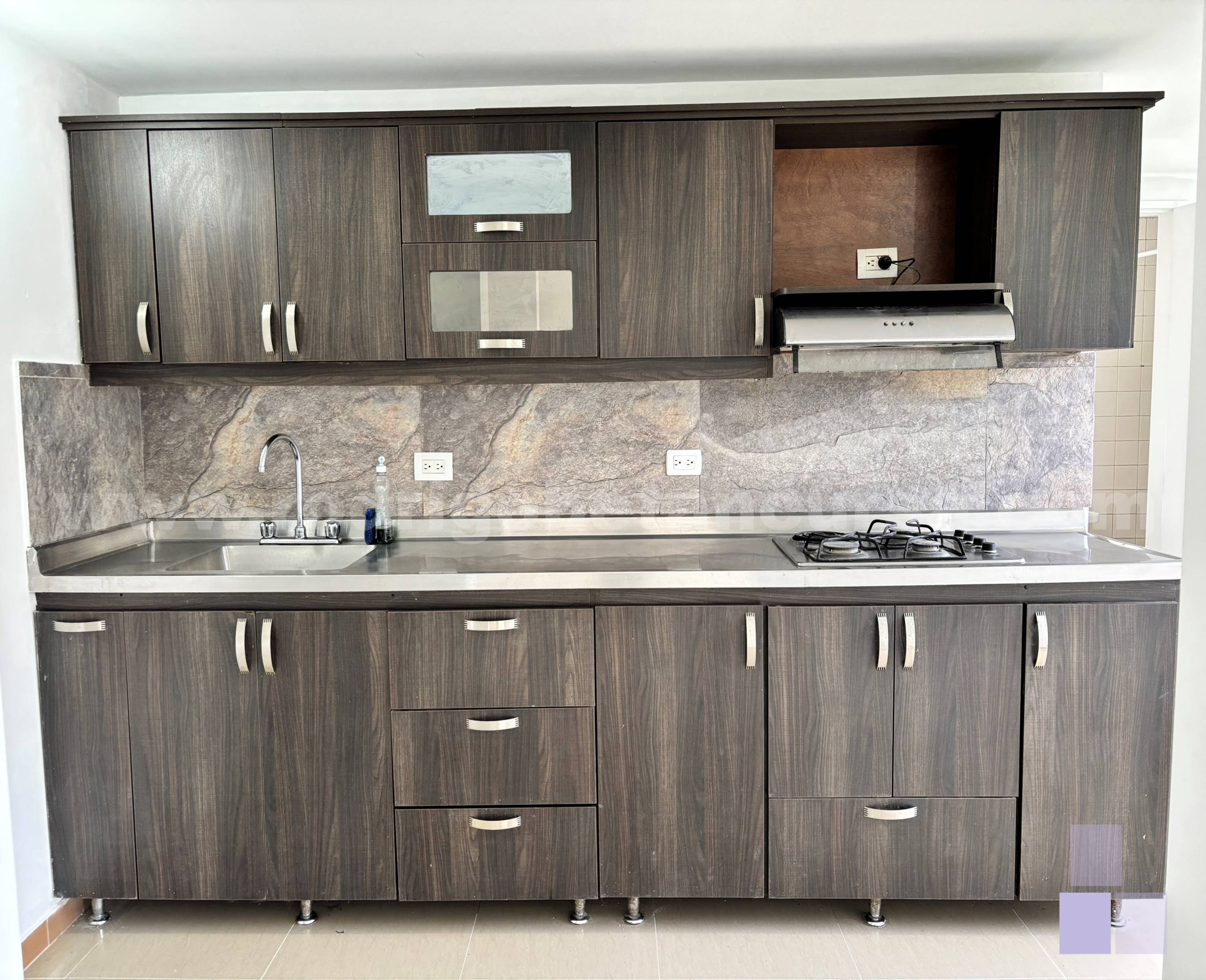 Cocina integral equipada con red de gas, amplios muebles de almacenamiento y zona de preparación práctica.
